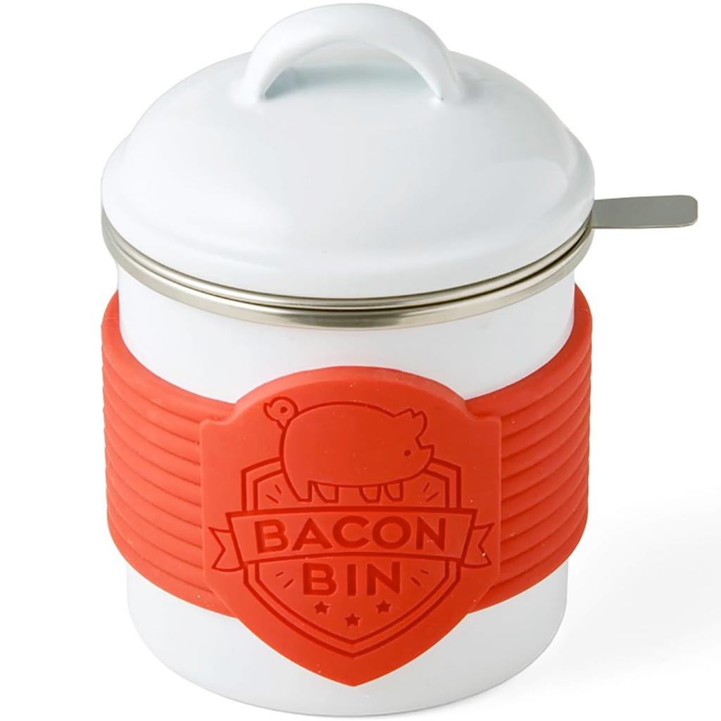 This metal bacon bin features a silicone sleeve to insulate your hands from the heat generated by hot bacon grease, along with a stainless-steel screen to filter out bacon bits. The easily removable inner container is made of stainless steel and goes in the dishwasher for cleanup. The body and the lid are made of enameled steel and are also dishwasher safe along with the silicone sleeve. The metal bacon bin has a capacity of 16 ozs. and measures 4.5" in diameter and 5.5" high.