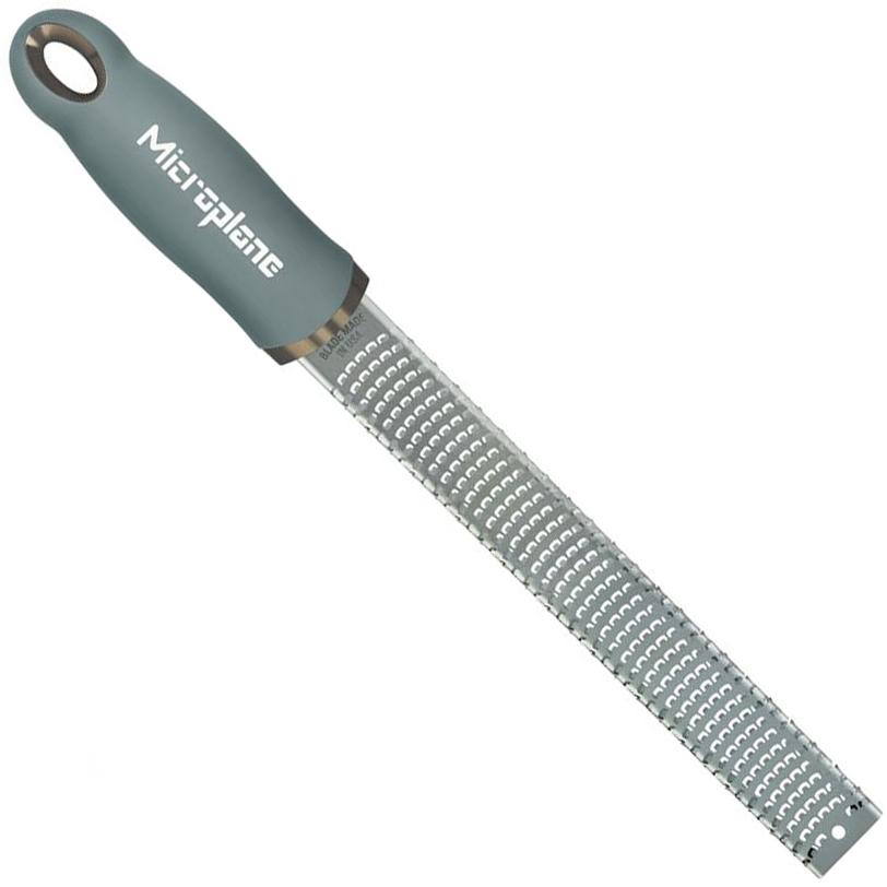 By now, the Microplane zester has become a staple in our kitchens. It's superior performance and ease of use have made it the zester of choice. The reason why is the array of micro-sized blades that actually shave little slices off citrus peel, ginger...whatever you're zesting. Old-fashioned zesters were simply sheets of metal with holes punched in them. To zest food, you applied pressure and forced the food into the holes, zesting by brute force. With Microplane zesters, little pressure is required. Instead, the razor-sharp blades do the work for you, quickly and easily producing showers of citrus zest. The Microplane Premium Series zester is the original Microplane; it's rasp measures 12" long and 1.5" wide. Dishwasher safe.