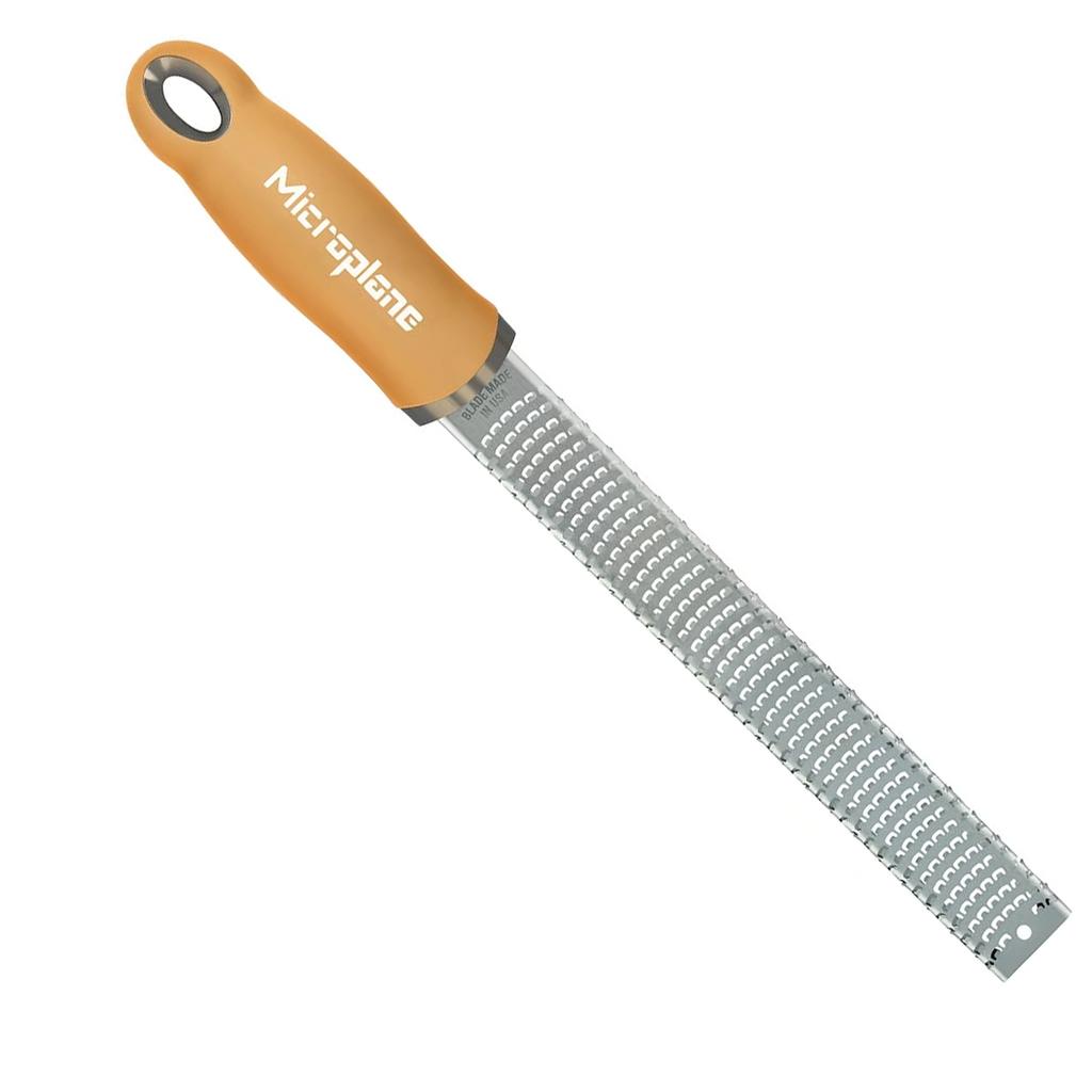 By now, the Microplane zester has become a staple in our kitchens. It's superior performance and ease of use have made it the zester of choice. The reason why is the array of micro-sized blades that actually shave little slices off citrus peel, ginger...whatever you're zesting. Old-fashioned zesters were simply sheets of metal with holes punched in them. To zest food, you applied pressure and forced the food into the holes, zesting by brute force. With Microplane zesters, little pressure is required. Instead, the razor-sharp blades do the work for you, quickly and easily producing showers of citrus zest. The Microplane Premium Series zester is the original Microplane; it's rasp measures 12" long and 1.5" wide. Dishwasher safe.