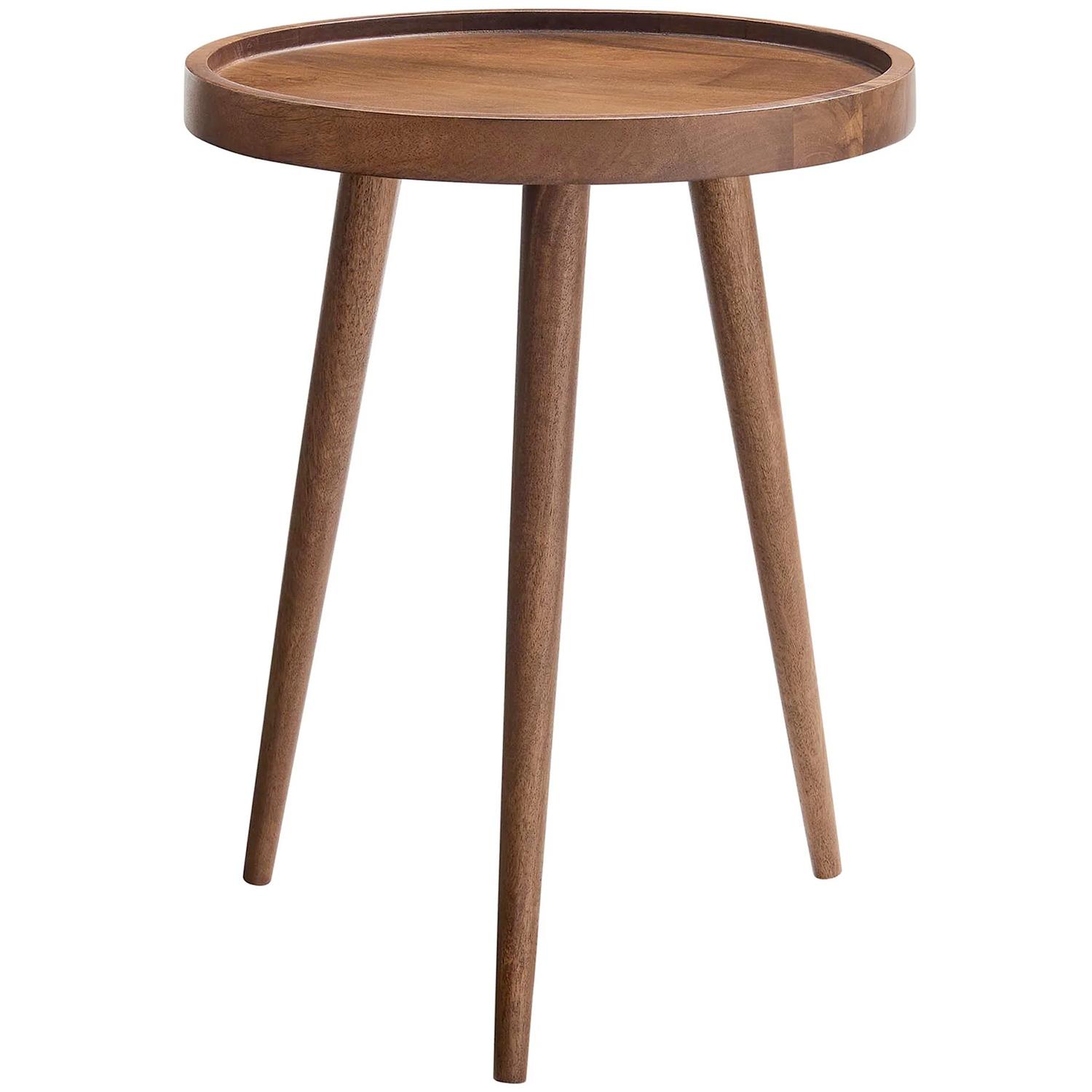 This charming little table is made of solid mango wood and features a tray-style top with a lip to keep items secure. It measures 18” in diameter and 21.6” tall.