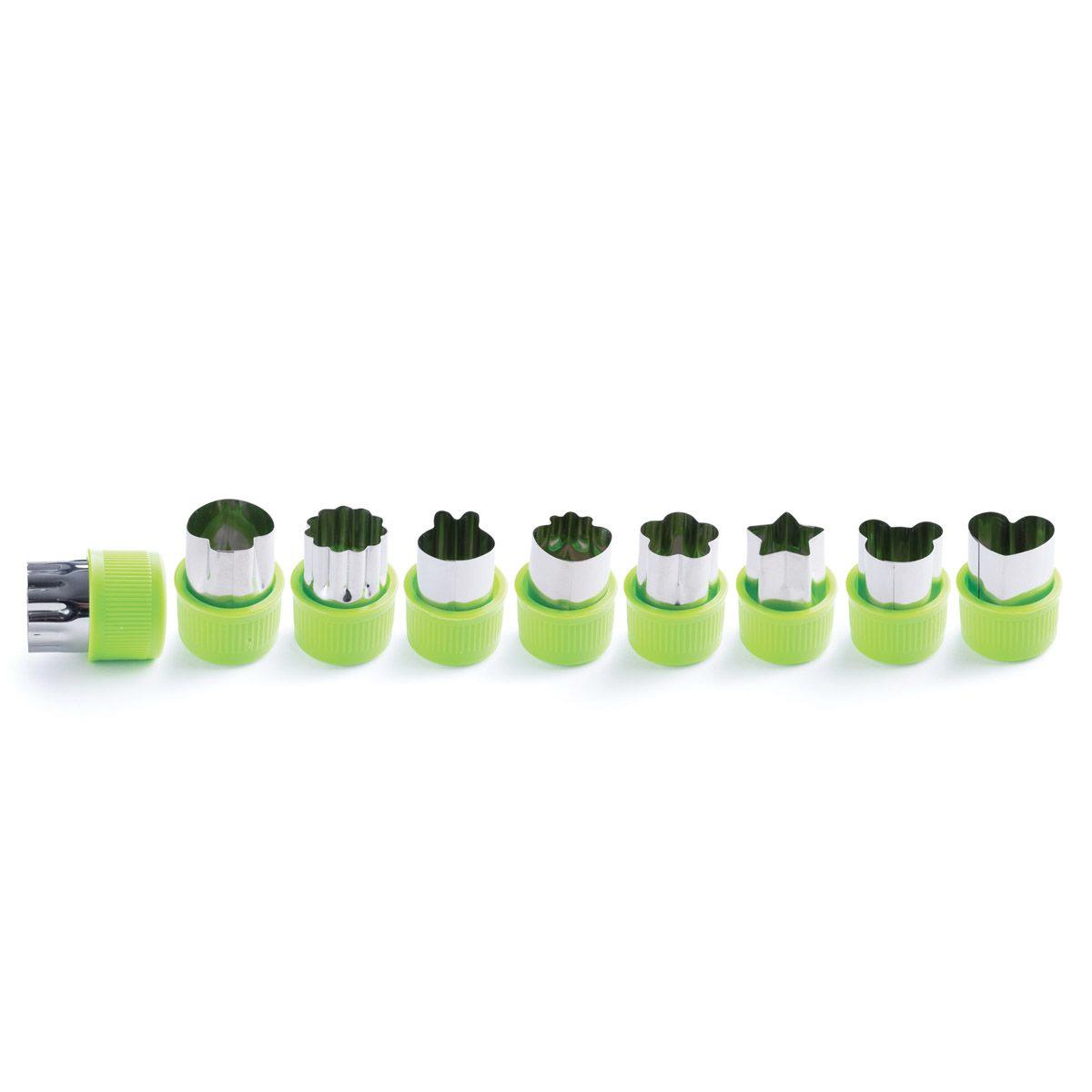 Have some fun with your food and cut decorative pieces of fruit, vegetables and cheese. Or, cut pie crust, biscuit, and cookie dough for baking, create shapes from cake, chocolate fudge, and more. The cutter edges are rolled for safe use by all ages, even kids. They're super easy to use; simply press the cutter edge into the food and twist gently to cut the desired shape. The set includes 1 each star, heart, mushroom, bunny/cat, flower, small fluted, strawberry, bear/dog (all 1" high), and 1 large fluted cutter (1.5-inch). Made from stainless steel and BPA-free polypropylene. Hand washing recommended.