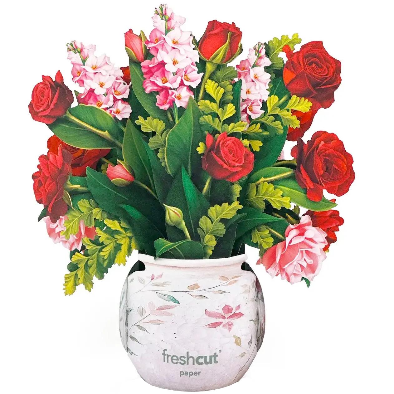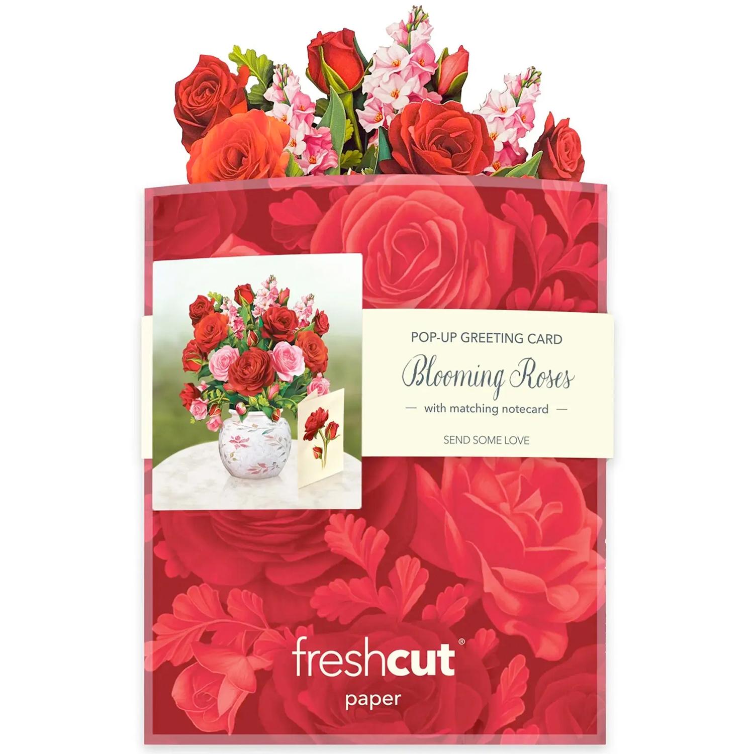 Brighten someone's day, whether it's a special occasion or not, with a paper mini pop-up greeting card. Not just a card, this paper creation includes a blank greeting card, a vibrant mailing envelope, and a pop-up bouquet of lushly blooming roses that’s printed on both sides. The pop-up bouquet measures approx. 6” tall and 5” wide.