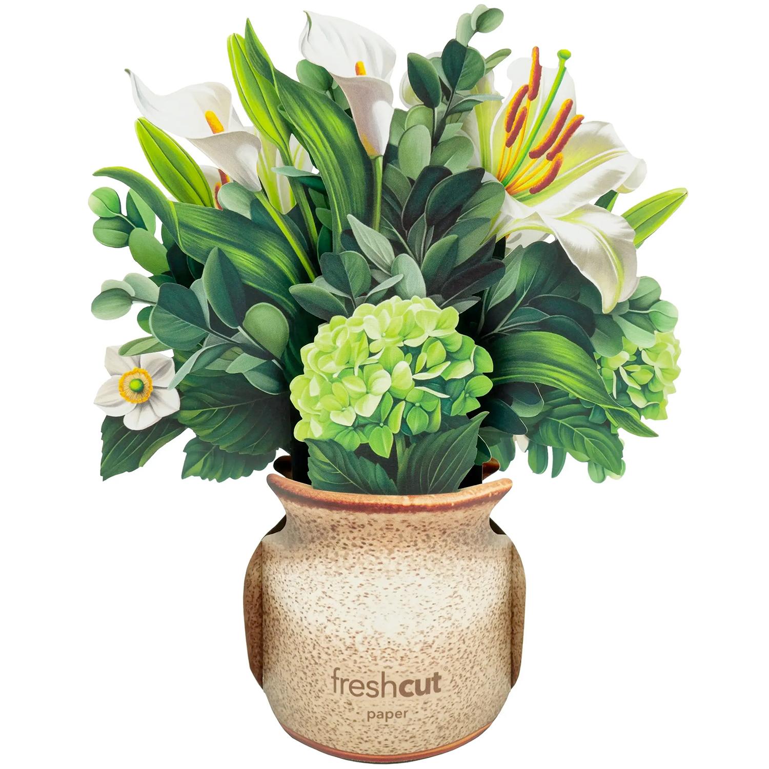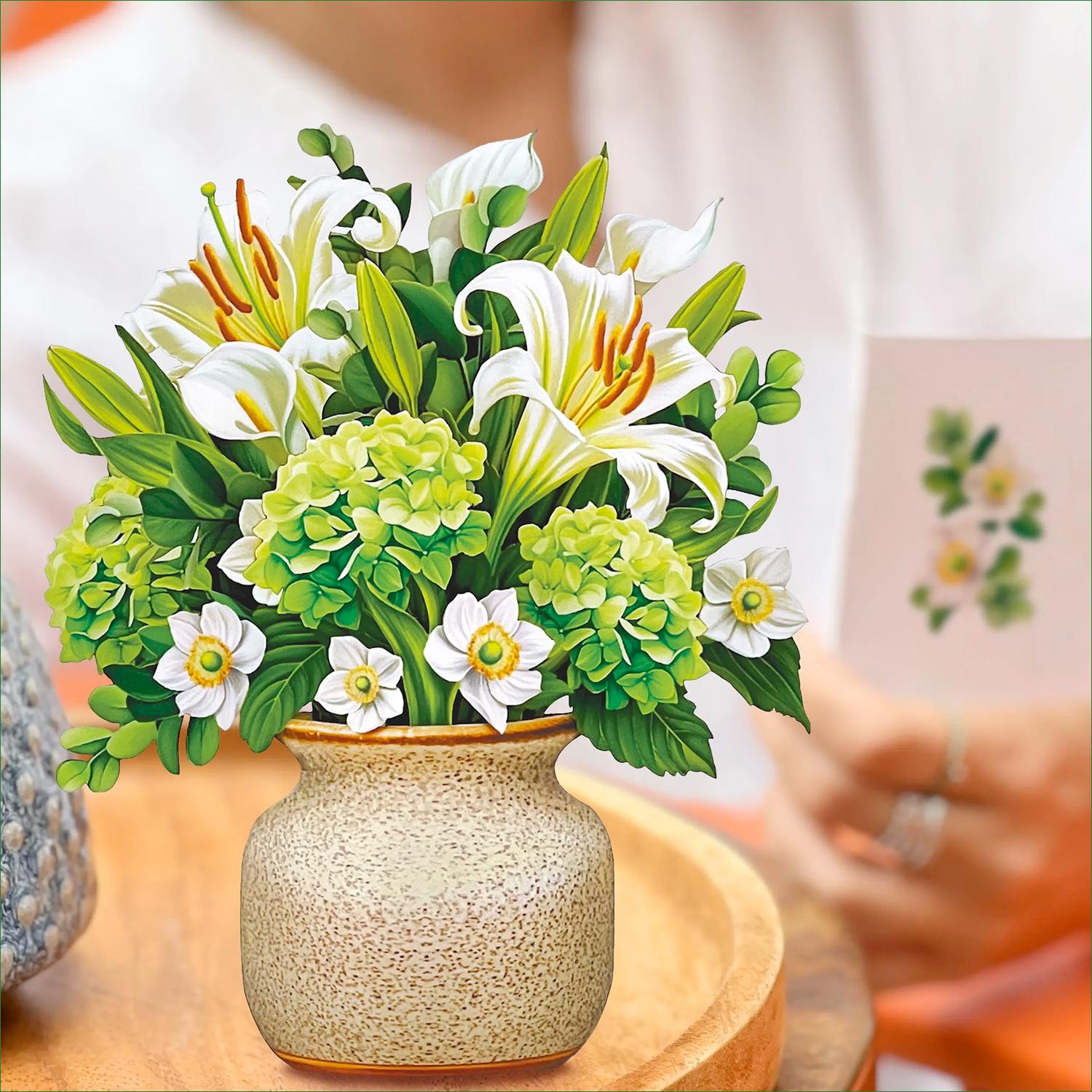 Brighten someone's day, whether it's a special occasion or not, with a paper mini pop-up greeting card. Not just a card, this paper creation includes a blank greeting card, a vibrant mailing envelope, and a pop-up bouquet of white lilies and calla lilies, alongside sweet anemones, green hydrangeas, and eucalyptus branches that’s printed on both sides. The pop-up bouquet measures approx. 5.5” tall and 5” wide.