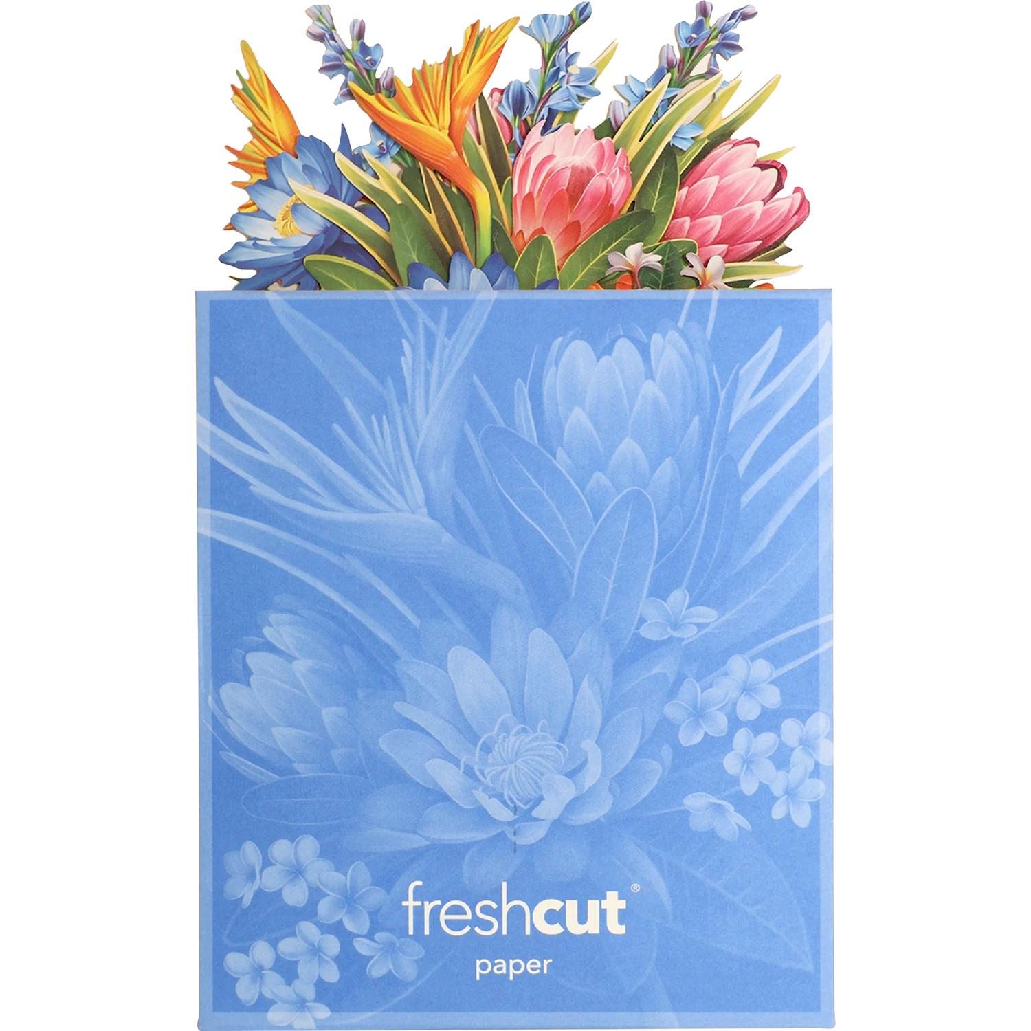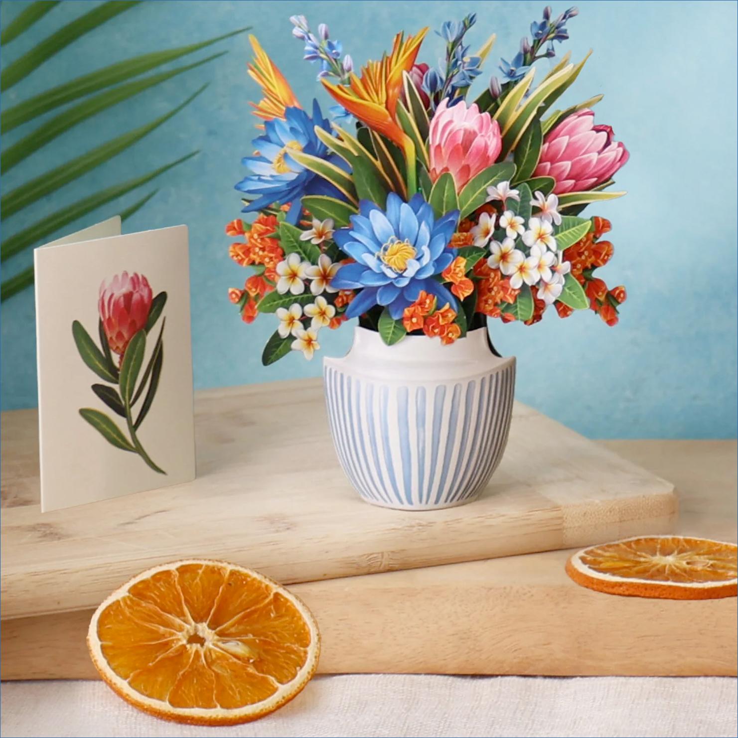 Brighten someone's day, whether it's a special occasion or not, with a paper mini pop-up greeting card. Not just a card, this paper creation includes a blank greeting card, a vibrant mailing envelope, and a pop-up bouquet of lush florals that’s printed on both sides. The pop-up measures approx. 6” wall and 5” wide.
