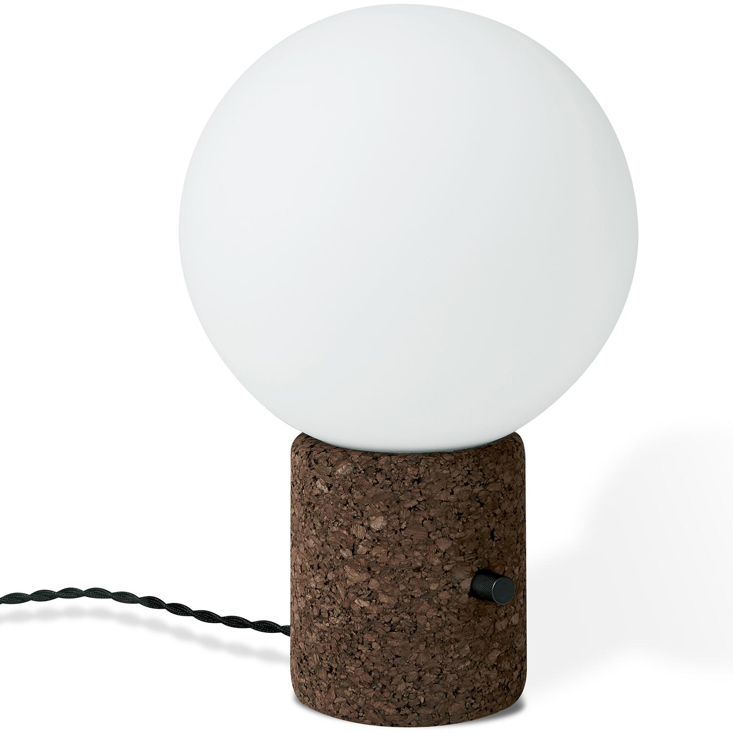 This charming little lamp features a smooth, translucent glass globe that contrasts with a base covered in natural cork. A knurled black knob in the base controls a dimmer, and a braided fabric power cord adds extra flare. The recommended bulb is a dimmable 60-watt incandescent or the LED equivalent. The Monocle’s glass shade measures 9.5” in diameter and the lamp measures 15.5” tall.