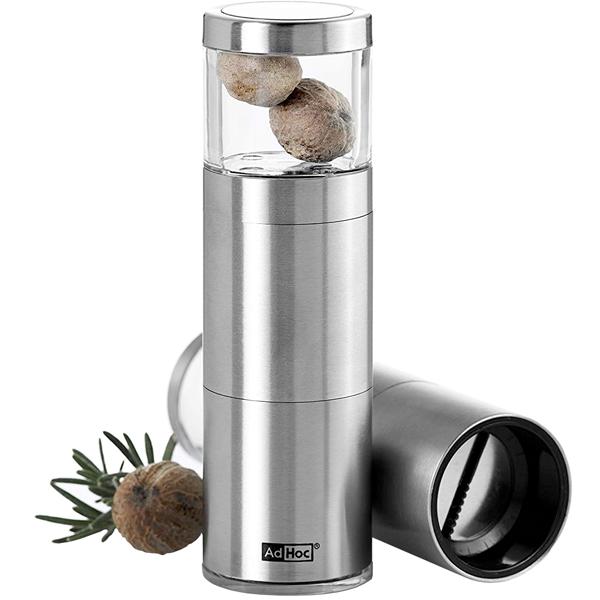 This sleek, stainless-still mill is designed expressly for shaving fresh nutmeg, creating one of life's great flavors. A spring-loaded bracket in the bottom presses nutmeg against the sharp stainless blade, which shaves off tiny flakes. The mill comes apart for access to the cutting compartment, while the acrylic storage compartment in the top holds spare nutmeg. 5" tall.