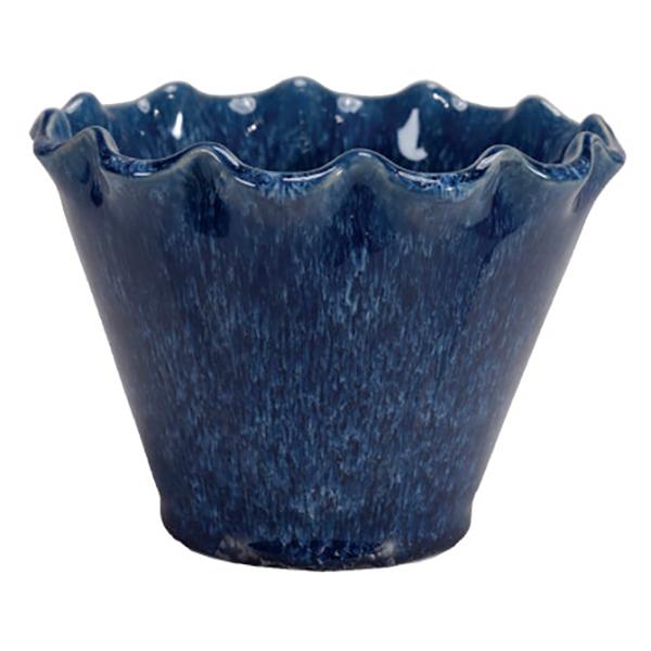 Made of rugged stoneware, this pot sports a ruffled rim, a drainage hole in the bottom, and a navy blue reactive glaze that ensures that each example is unique in appearance. It measures 5.25" in diameter and 4" tall and will accommodate a 3" grower's pot.