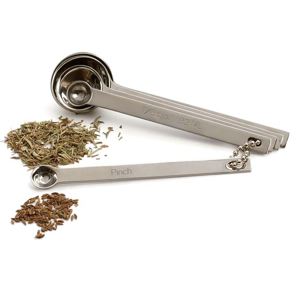 Okay bakers, here are the "odd-size" measuring spoons that you know are not really that odd. You get spoons in 2 teaspoons, 1.5 teaspoons, 2/3 teaspoon, 1/8 teaspoon, and pinch (1/16 teaspoon) sizes, each made from a single piece of stainless steel with a rounded bottom. Dishwasher safe.
