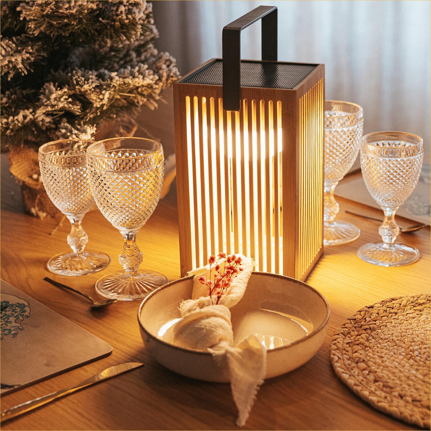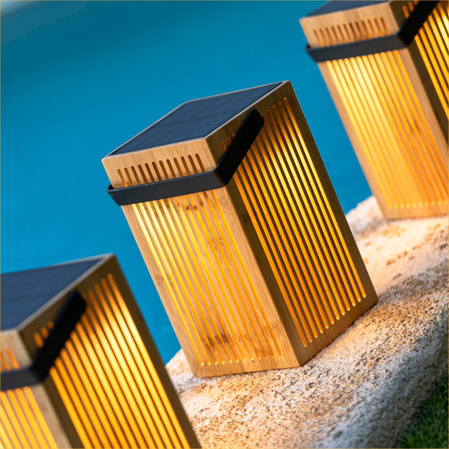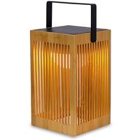 Framed in beautiful bamboo, the Okinawa lantern provides elegant, cordless lighting indoors or out. For outdoor use, it features a solar cell in the top which charges a battery to power the LED. The battery is also rechargeable via a USB converter (not included) for indoor use. Wherever you use it, the Okinawa lantern is turned on and off, as well as dimmed, via an included remote control. 6” x 6” x 9” high with a powder-coated steel handle for easy transport.