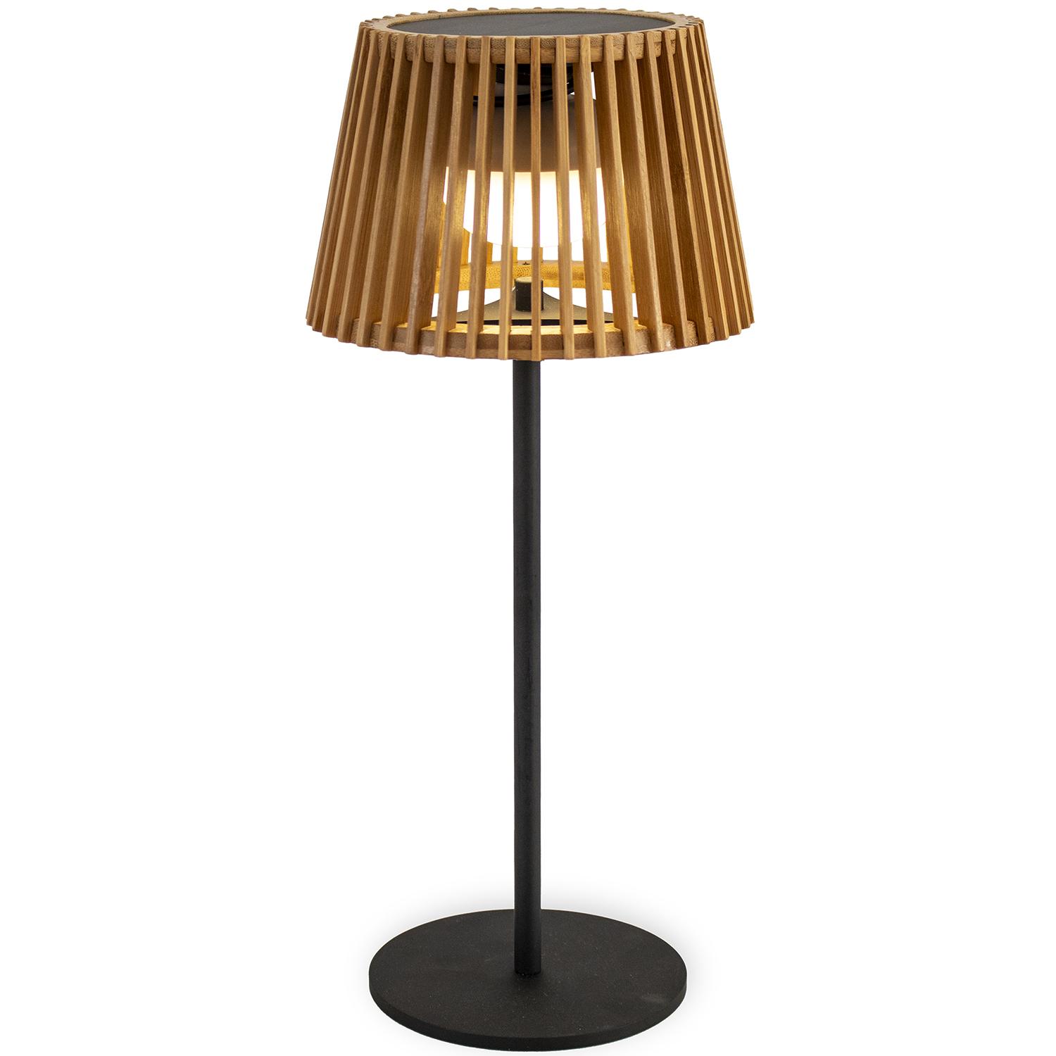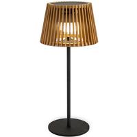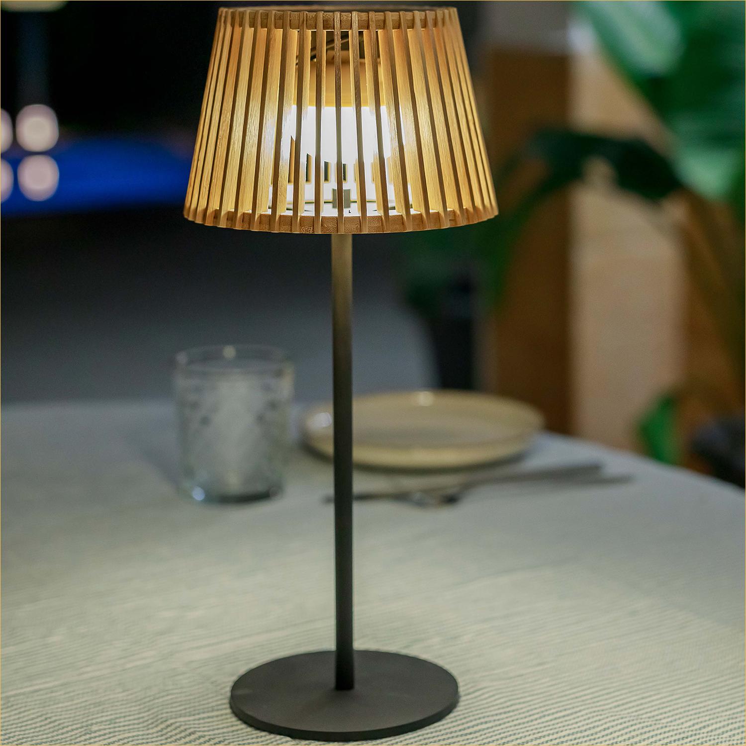 The Okinawa table lamp features an elegant bamboo shade on a powder-coated steel frame, and provides elegant, cordless lighting indoors or out. For outdoor use, it features a solar cell in the top which charges a battery to power the LED. The battery is also rechargeable via a USB converter (not included) for indoor use. Wherever you use it, the Okinawa table lamp is turned on and off, as well as dimmed, via an included remote control. 6.5”-dia. shade, 14” tall.
