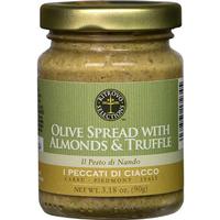 This enticing tapenade from the Piedmont is made with green olives, black truffles, ground almonds, and olive oil. The strong flavor of truffle is tempered by the nutty and zesty flavors of the almonds and olives. It's perfect for a ready-to-eat dip, as a topping for bruschetta, or try it as a sauce for white fish and chicken breast, or paired with fresh mozzarella and slices of baguette. 3.18-oz. jar.