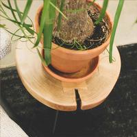 The thick top of the Organic martini table features the natural edge of the lumber with elegant curves, lines and waves that are dependent on the intrinsic traits of the natural wood. The shapes, sizes and knots will vary leaving no two pieces alike. Mounted on a black, powder-coated frame, the larger Organic table measures roughly 10.5” in diameter and stands 22” tall.