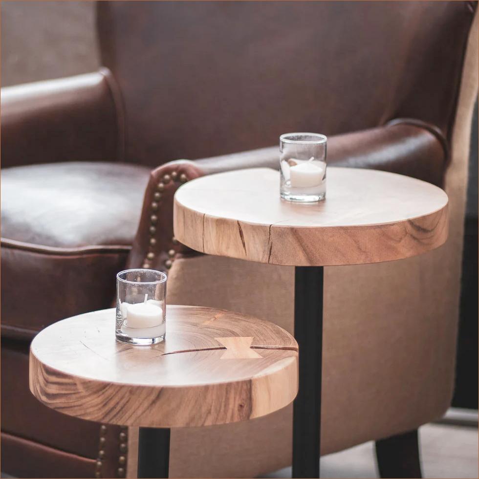 The thick top of the Organic martini table features the natural edge of the lumber with elegant curves, lines and waves that are dependent on the intrinsic traits of the natural wood. The shapes, sizes and knots will vary leaving no two pieces alike. Mounted on a black, powder-coated frame, the smaller Organic table measures roughly 10.5” in diameter and stands 18” tall.