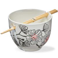 Made from durable stoneware this 16-oz. noodle bowl features hand-painted, wax-resist details and is complete with bamboo chopsticks. It measures 5” in diameter and 3.9” high. Dishwasher and microwave safe bowl, hand wash the chopsticks