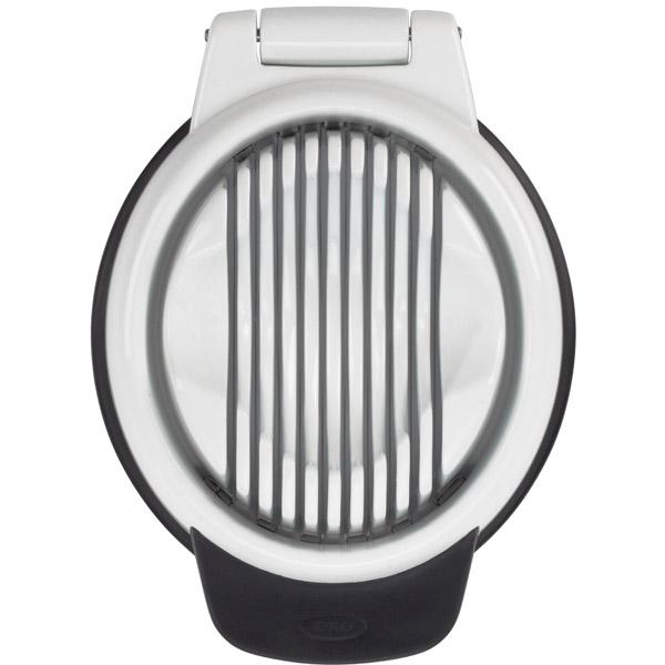 This OXO egg slicer cuts precise 5 mm slices with one simple press. It will cradle the egg in either of two directions, giving you the option of round or oblong slices. You can even cut one way, then rotate the egg the other way, to dice eggs for salads. The raised handle is easy to open and close, and the non-slip base provides a comfortable grip while slicing over bowls or plates. Top-rack dishwasher safe.