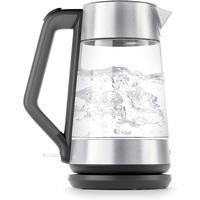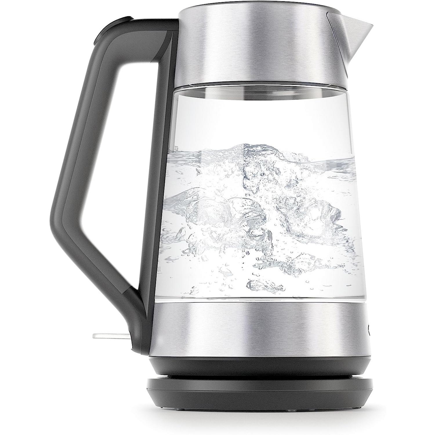 This is a watched pot that always boils. And does it quickly, faster than in a microwave and safer than on the stovetop. With the cyrstal-clear borosilicate glass body, you can see the water boiling, but even if you're not watching, an auto-shutoff mechanism turns the kettle off when the water reaches a rolling boil. It can't boil dry like a stovetop kettle. The soft-touch handle always stays cool to the touch, and a soft-open lid prevents a quick out-rush of steam when you pour. The cord stays attached to the 360-degree swivel base, so when you go to pour water, no cord gets in your way. The OXO on water kettle has a capacity of 1.75 liters and the body has convenient measurement markings in both ounces and milliliters.
