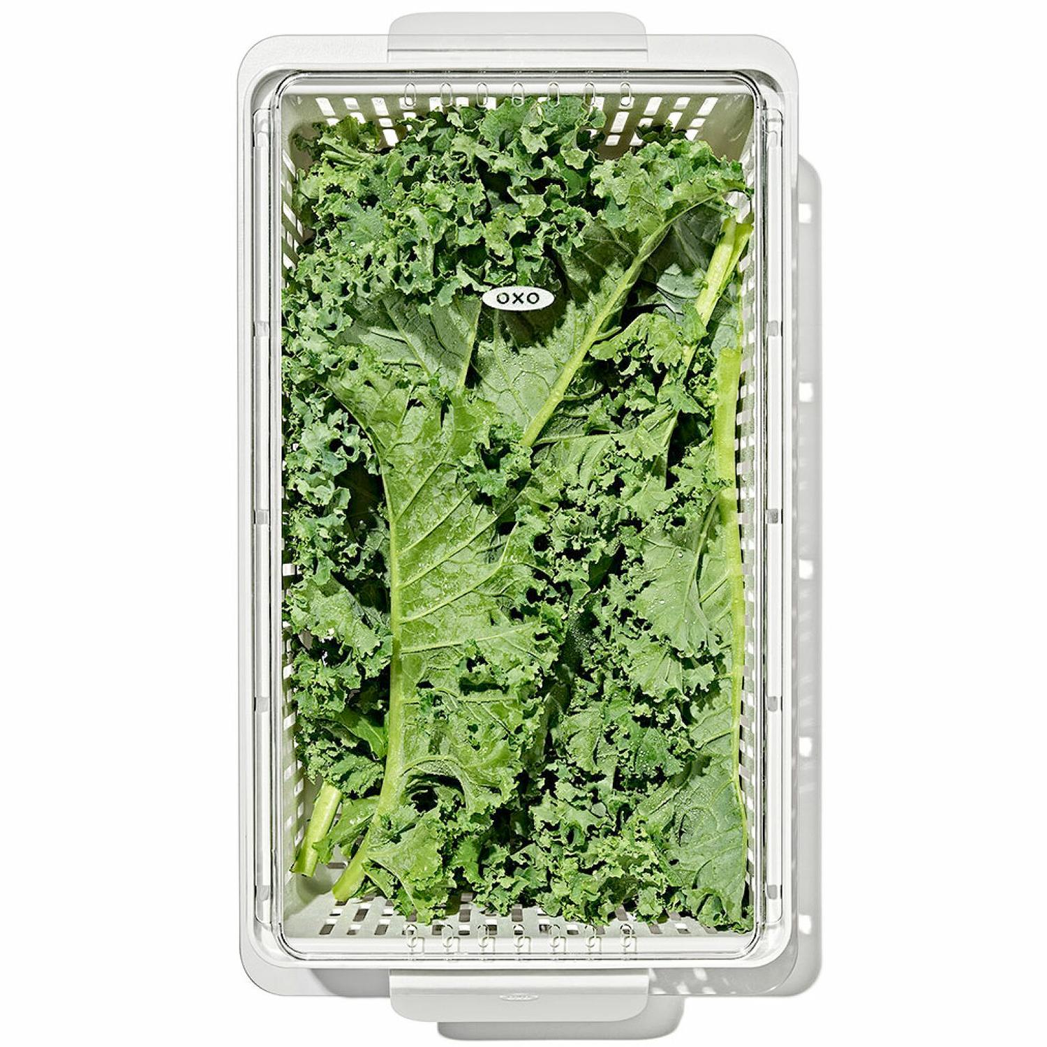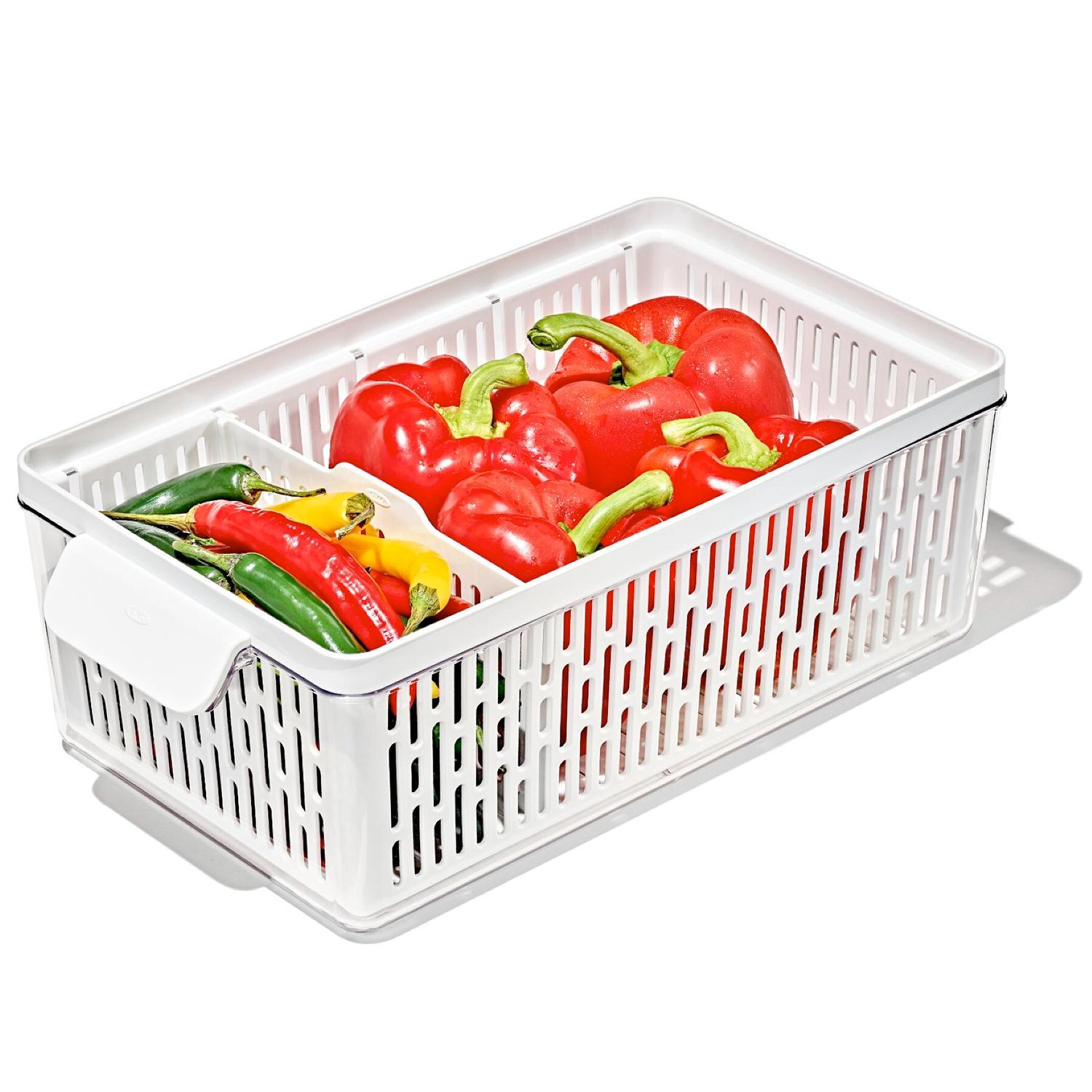 This OXO produce saver is the perfect size for storing leafy greens, peppers, grapes, and other fruits and vegetables. The adjustable divider keeps produce organized and visible, while the inner basket keeps fruit and vegetables elevated, promoting optimal air circulation to keep things fresh. Plus, the basket is removable so you can use it to rinse produce, eliminating the need for a separate colander. This stackable bin measures 13.8” x 7.4” x 4.7” and is dishwasher safe.