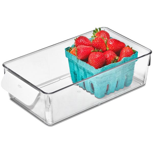 OXO's refrigerator storage bins help you organize the contents of your fridge, cut down on clutter, and prevent food waste. The clear, space-saving bin design provides a visually pleasing way to keep food from getting lost, getting old, and going to waste. The rounded handles provide a comfortable grip, especially helpful while prepping a recipe or grabbing a snack. A smooth base allows the bins to slide easily on fridge shelves, so you can keep an eye on food expiration dates. The 5.75" x 10.75" x 3" size is ideal for holding yogurt cups, berry bins and small produce. Hand washing recommended.
