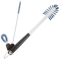 OXO's handy set includes a long bottle brush, great for cleaning inside water bottles; a straw brush, which easily gets inside sports bottle straws; and a detail cleaner, which gets into the crevices of caps and lids. All three have durable nylon bristles. They store together on a handy ring and snap off for use. The bottle brush is 14" long, the straw brush measures 10.5" in length.