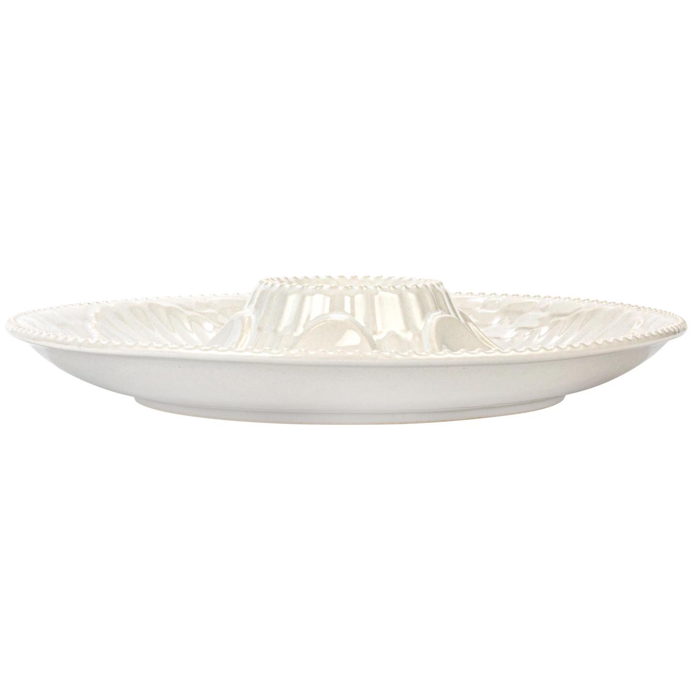 This 10"-diameter oyster plate is made of durable stoneware and features a matte-white glaze. Dishwasher safe.