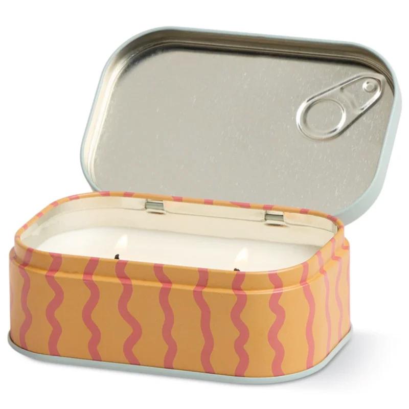 This 4.5-oz. tin candle features a faux pull-tab that’s inspired by sardine tins, beautiful artwork, pure soy wax, a cozy glow from two wicks, and a comforting scent. The fragrance features top notes of Orange and Apricot; middle notes of Tangerine, Grapefruit, Green Pineapple, and Cedar; and base notes of Fir, Balsam, and Amber.