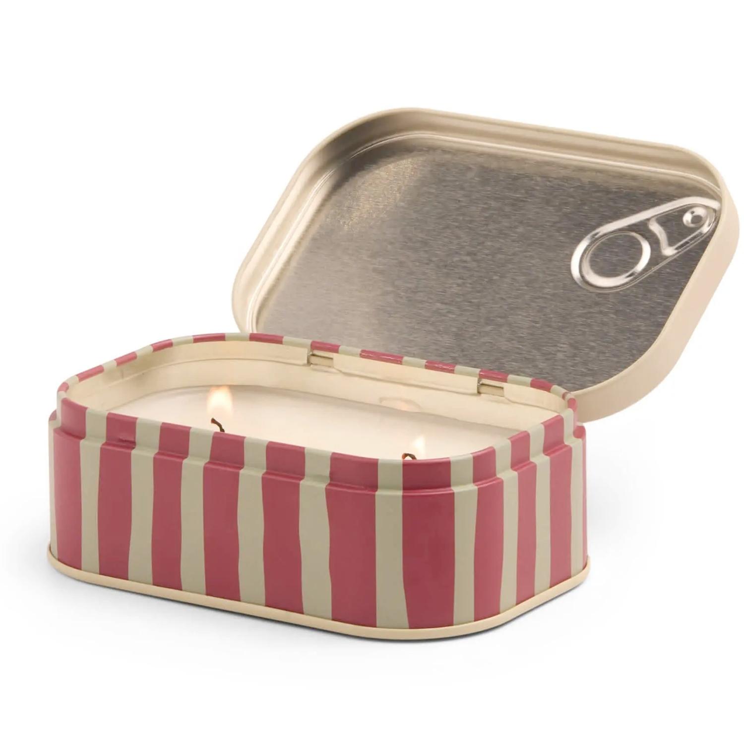 This 4.5-oz. tin candle features a faux pull-tab hat’s inspired by sardine tins, beautiful artwork, pure soy wax, a cozy glow from two wicks, and a comforting scent. The fragrance features top notes of Morning Dew, Tangerine Zest, and Meyer Lemon Leaves; middle notes of Strawberry Vine, Watermint, and Honeydew Melon; and base notes of Sugar Crystals, Geranium, and Golden Saffron Threads.