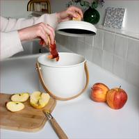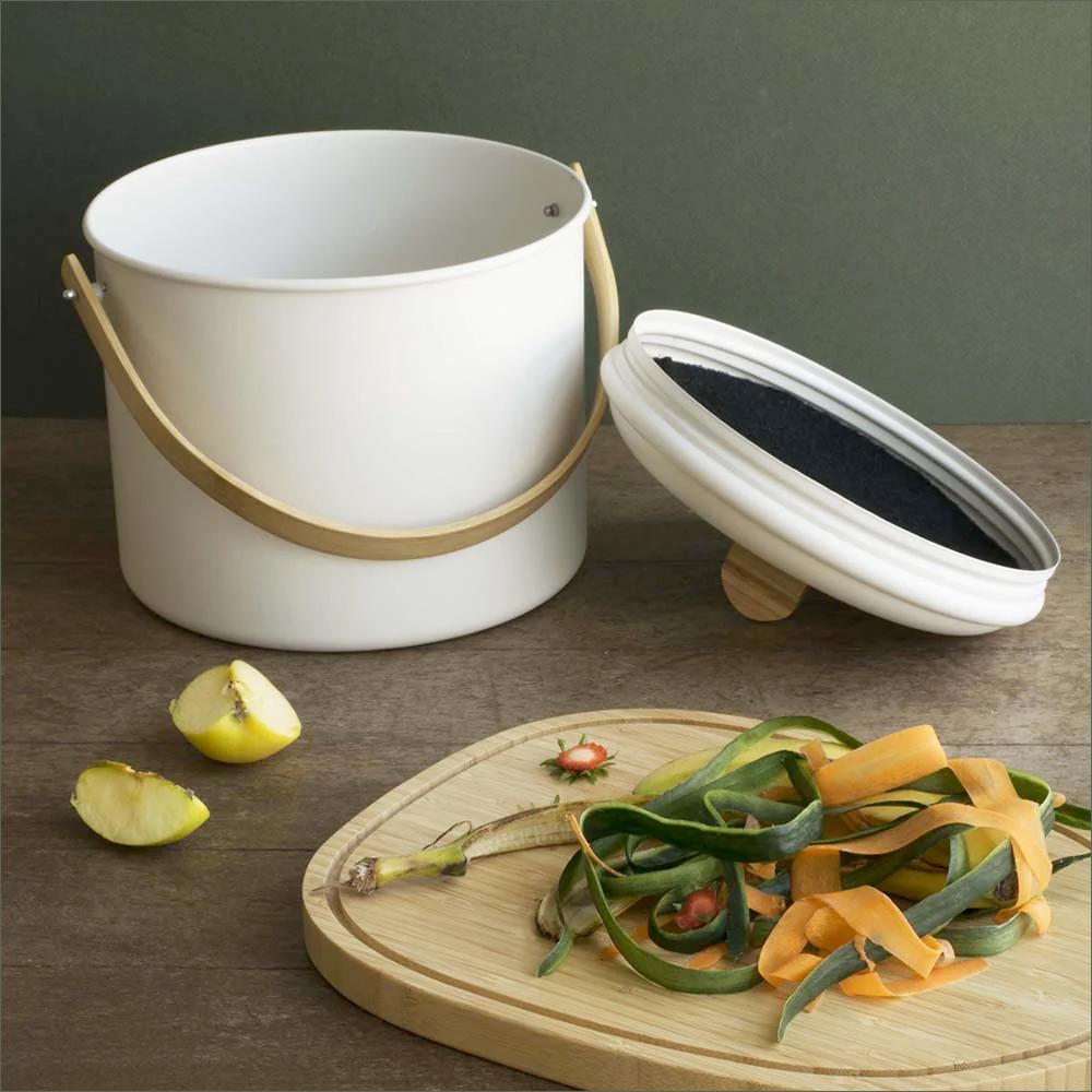 Made of steel, with a bamboo handle, this compost bin features an airtight lid to keep bugs out and a charcoal filter to control odors. The filter can be washed in cool water and re-used. The Pebbly compost bin measures 8.7” in diameter and 7.1” high.