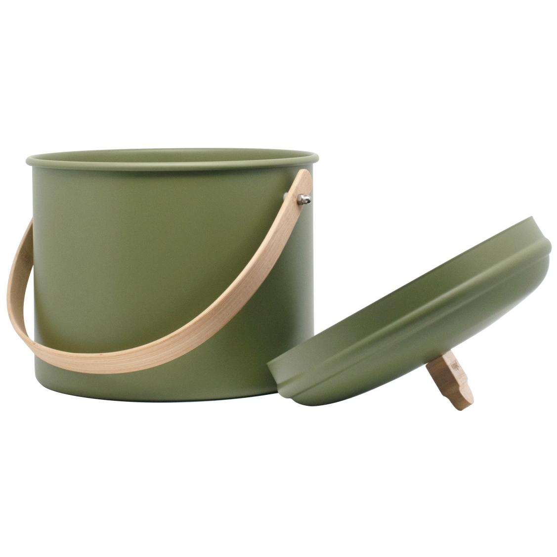 Made of steel, with a bamboo handle, this compost bin features an airtight lid to keep bugs out and a charcoal filter to control odors. The filter can be washed in cool water and re-used. The Pebbly compost bin measures 8.7” in diameter and 7.1” high.