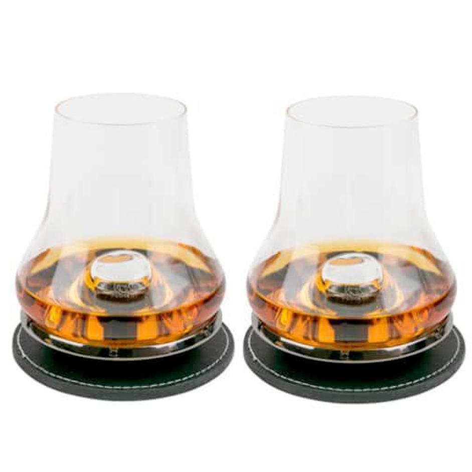 This elegant set includes two whiskey tasting glasses and two matte black chilling bases that cool your spirits without dilution. The glasses are carefully shaped to concentrate and enhance the aromas and flavors of fine whiskeys. The chilling bases stay in your freezer, and when placed under the glasses, within a couple of minutes cool the whiskey by 6-8 degrees without the dilution of melting ice. Two coasters protect fine table finishes from scratches and condensation. It's all nicely boxed to make a great gift for whiskey experts and beginners alike.