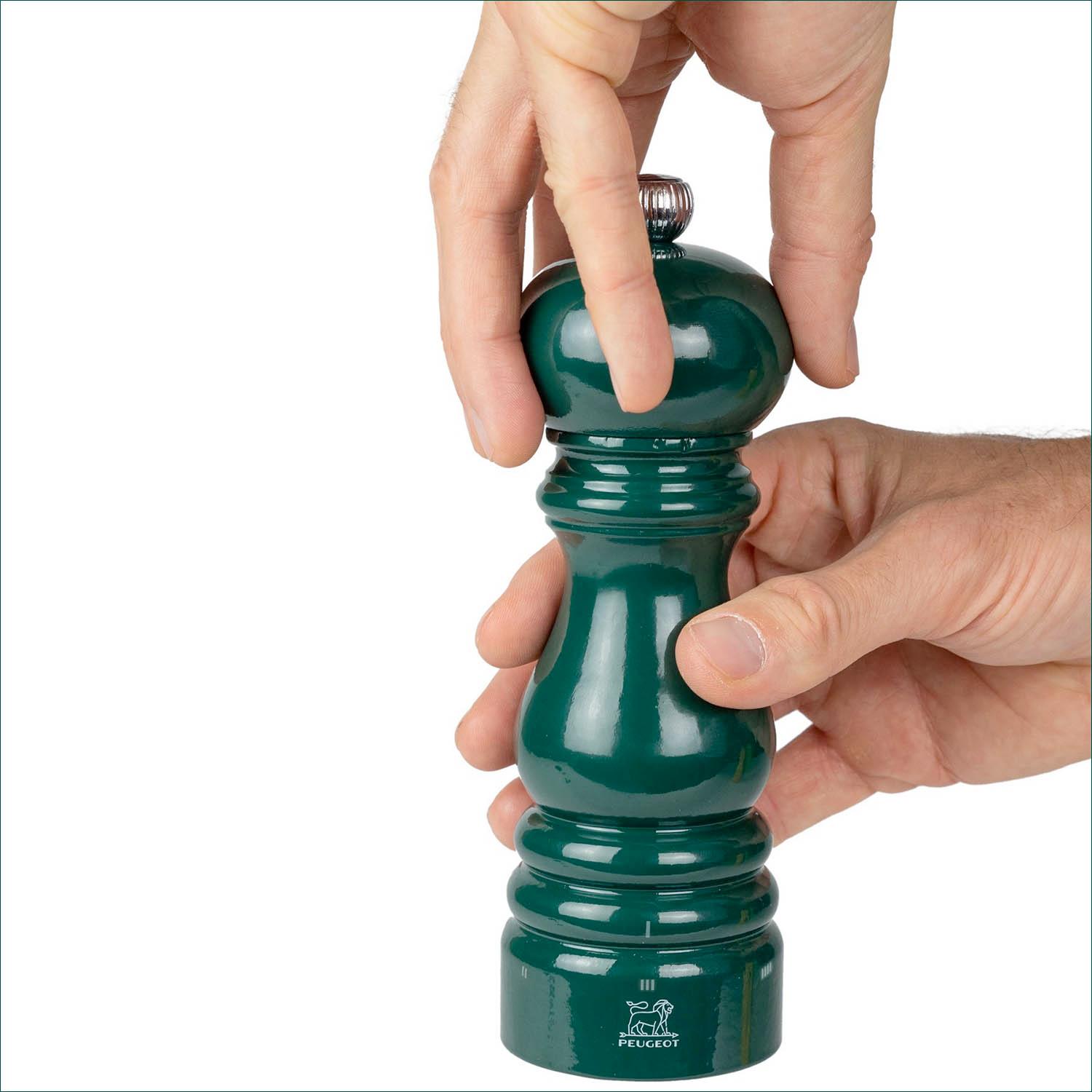 The Peugeot name stands for the finest in pepper and salt mills. This Peugeot Paris mill offers a classic, elegant shape suitable for the finest table, finished a rich, glossy dark green. Paris mills are made of solid beech, grown, harvested, shaped and finished in France, with an adjustable grinding mechanism. Peugeot's exclusive U-Select system provides grinding adjustment at the bottom, with a twist of the bottom ring. This enables any adjustment between powdery-fine and ultra-coarse. The selected grind stays in place until it is changed. Peugeot salt and pepper mills are backed by a lifetime guarantee on the grinding mechanism and a 2-year guarantee on the entire mill.