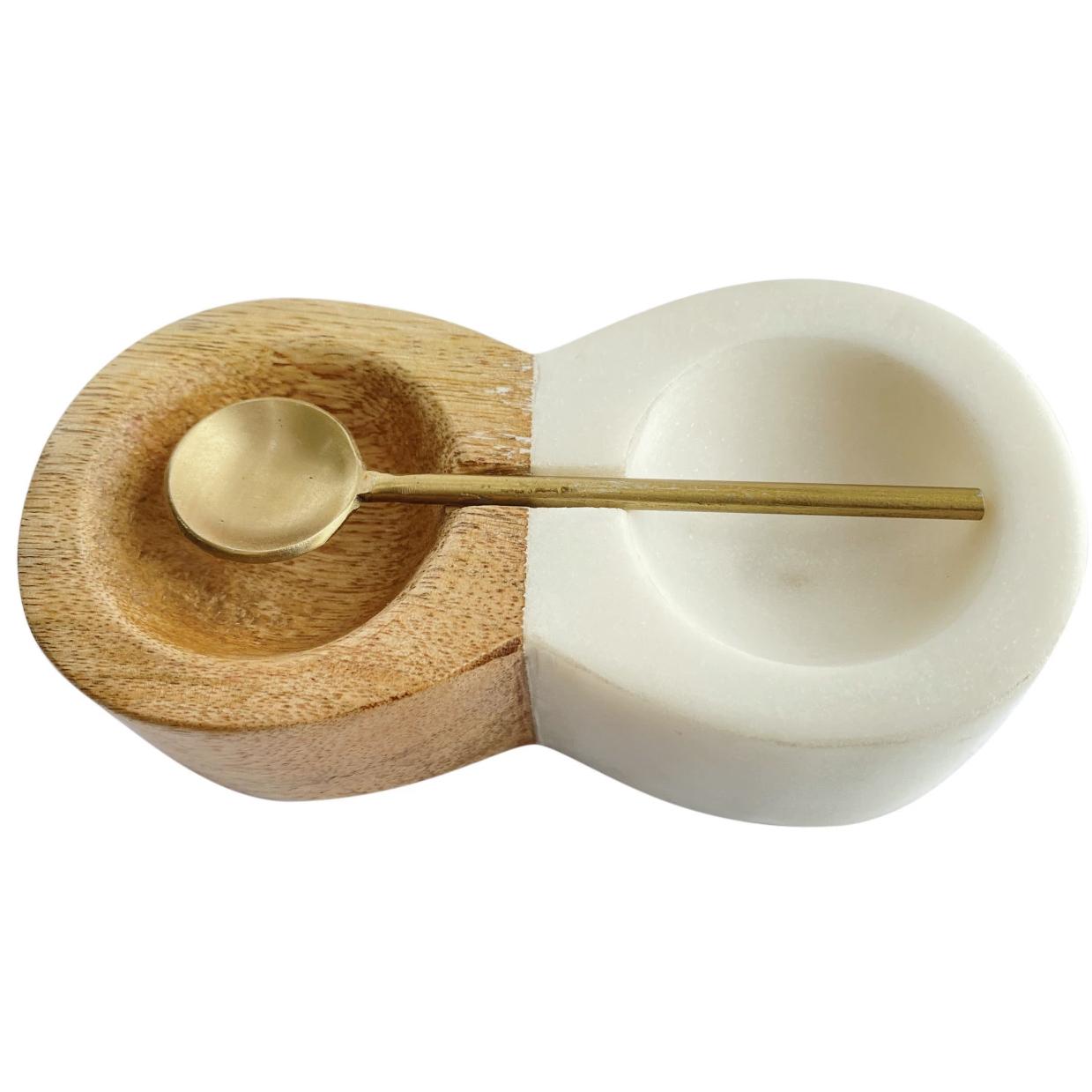 One pinch pot made of mango wood, the other of marble, bonded together with a brass spoon for serving. Perfect for salt and pepper and spices. The pots measure 4.75" x 2.5" x 1.5" high.