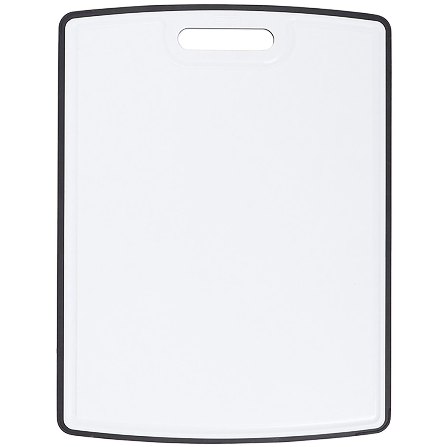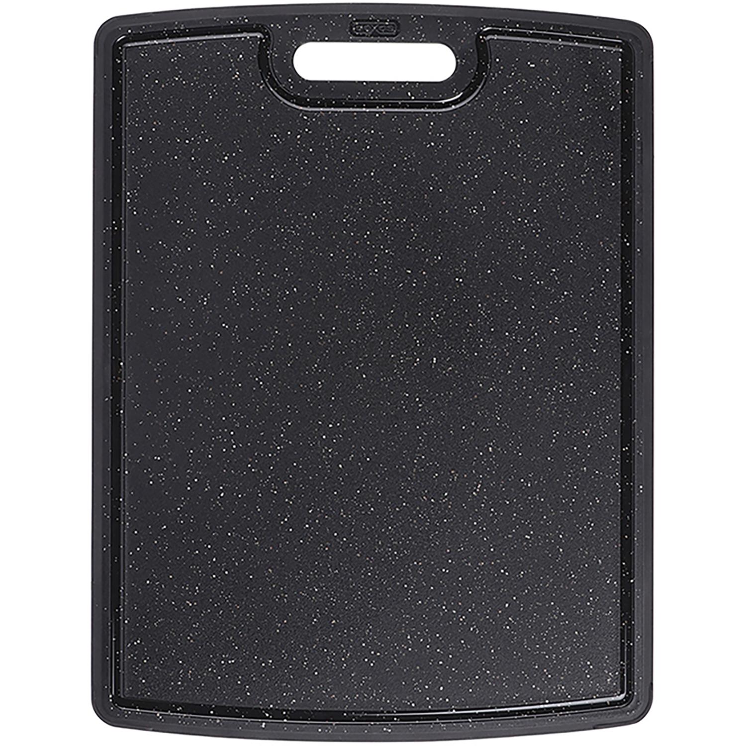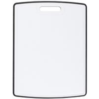 This highly practical cutting board is white on one side, speckled black on the other, and made of BPA-free, dishwasher-safe polypropylene. It won't split, crack, warp, or peel, and is gentle on your fine knives. Plus, both sides feature a juice groove to help keep countertops clean. 11" x 14.5".