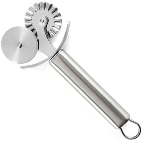 Cut dough and pastry of all kinds, from cookies to pie crusts to ravioli, with this double-headed cutter that gives you a choice of fluted or straight edges. It's made of polished stainless steel and measures 7" long. Hand washing recommended