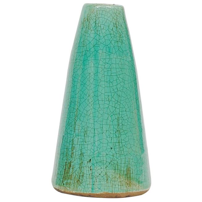 This rustic vase features a crackle-finish reactive glaze that makes each example unique in appearance. 8" tall.