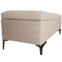 Both stylish and practical, the Reece storage bench features room to store throws, pillows, games, toys, or whatever, while offering seating comfort on the padded, quilted top. It features a pine frame; black, powder-coated metal legs, and polyester fabric and measures 47.5” long, 20” deep and 18.5” high.