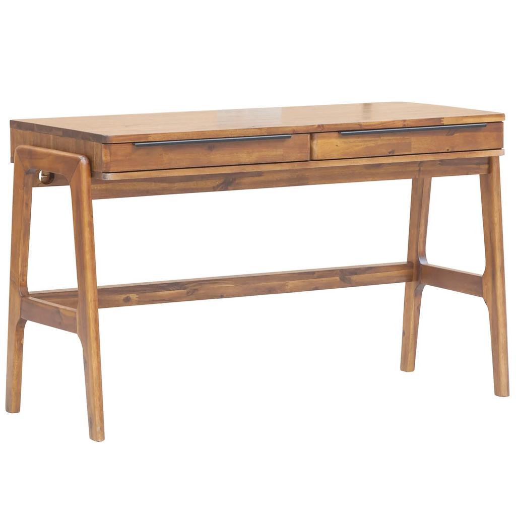 Hand-craftd from solid acacia, this mid-century-modern desk features black metal handles and two drawers. It measures 49.3 wide, 19.7" deep, and 30" high.