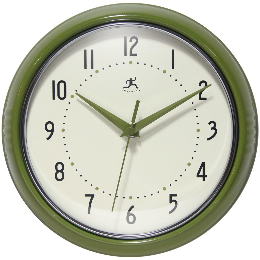 Accurate quartz mechanism, metal case, glass lens, and a cool retro look. 9.5" in diameter, requires a single AA battery (not included).