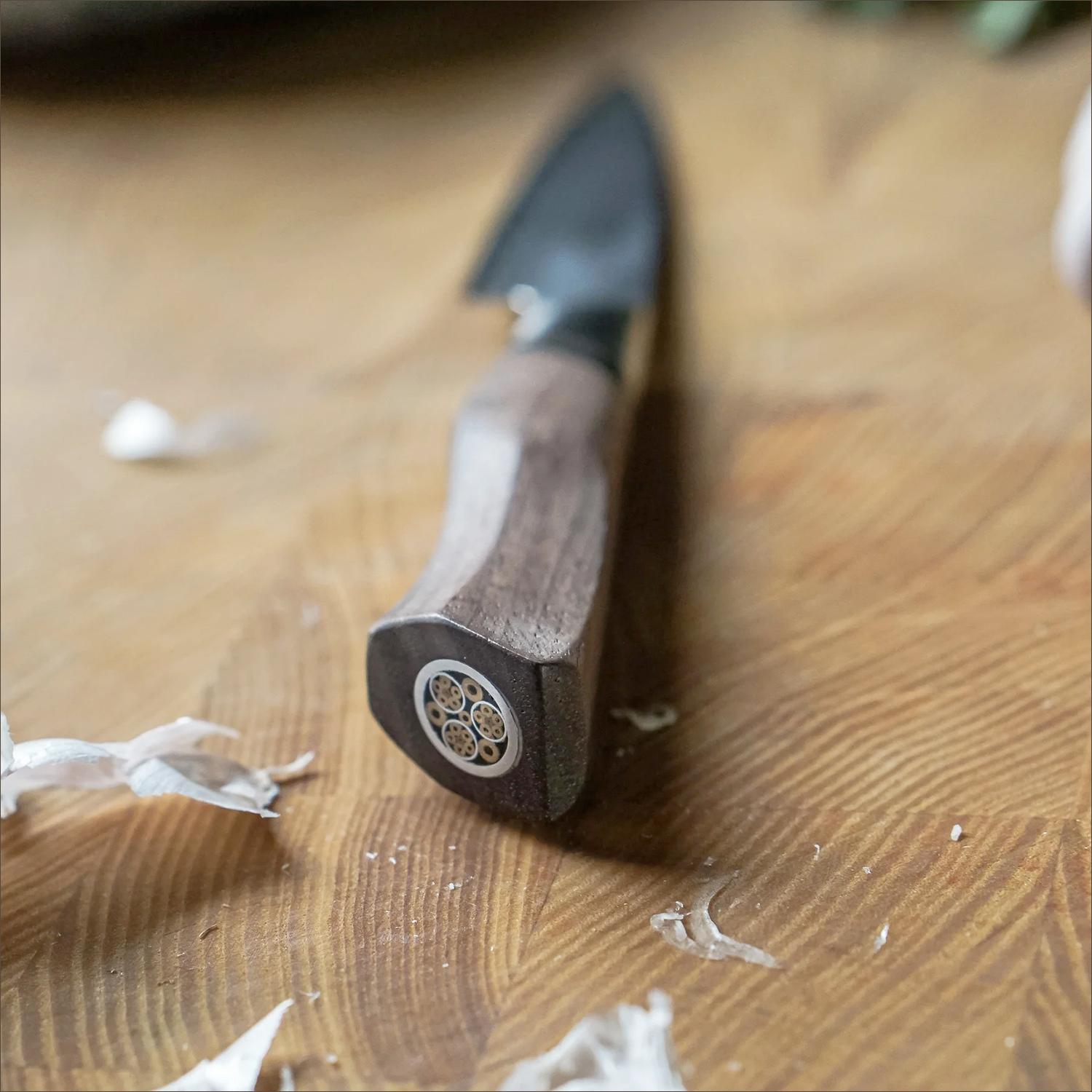 A-30 knives from Ryda are tailored to suit those who are accustomed to holding the knife in a ”pinch” grip over the blade. A-30 knives are characterized by their lightweight and well-balanced construction, providing a pleasurable and efficient experience for chefs. Unlike other knives that often lead to discomfort and sore fingers, the design of the A-30 series is the culmination of decades of kitchen experience and years of meticulous refinement. For the blade Ryda has chosen a 3-layer steel with an Aus-10 steel core, a renowned steel celebrated worldwide for its high performance. With a hardness rating of 60 HRC, it allows for easy sharpening when needed, while being sufficiently robust for tasks where hardness is critical. Furthermore, the steel undergoes a vacuum treatment to enhance its durability. The edge is sharpened to 15° on each side, ensuring the ease of sharpening when necessary. A-30 handles are crafted from stabilized walnut wood, which attains extra hardness through the vacuum treatment process.
