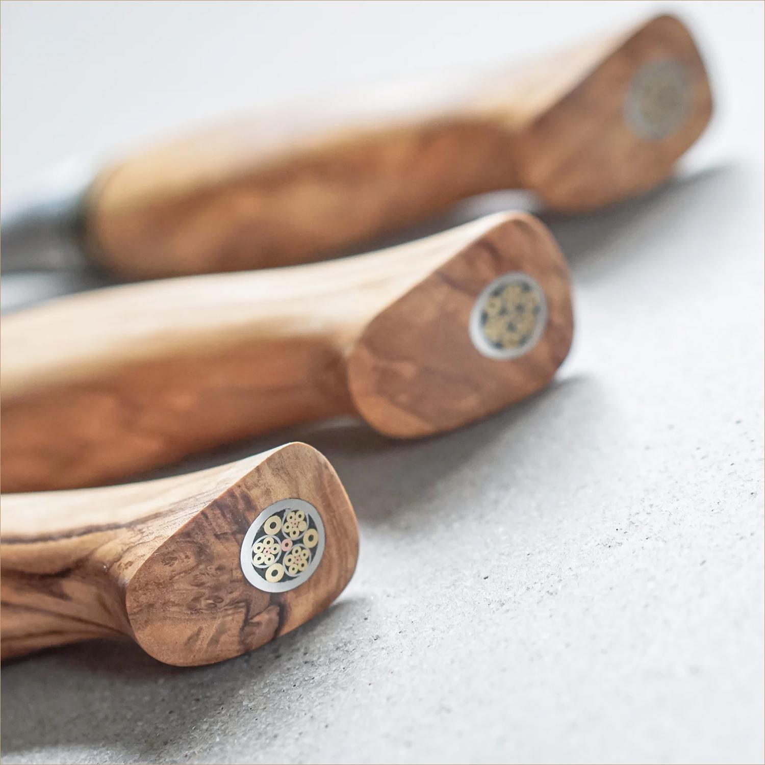 The steel of Ryde’s ST-650 series is a work of art, characterized by the unique pattern on the blade, enveloping Ryde’s proprietary ST650 powdered steel. By heating the Damascus blade, Ryda alters the layers of steel in the knife, revealing a distinctive pattern. The core steel at the center of the blade maintains world-class quality and achieves a score of 820 when tested on the Catra scale (for edge sharpness and longevity ). ST-650 knives feature a 15° blade edge angle to facilitate easy blade resharpening as needed. The hardness of Ryde’s ST-650 blades ranges from 62-63 HRC, making them among the hardest blades on the market. Furthermore, they are cryo-hardened, one of the most expensive and effective processes for maintaining a knife’s hardness, ensuring exceptional durability. ST-650 handles are crafted from French olive wood that has been meticulously dried, moisturized, dried, and moisturized again until it attains the desired hardness. These handles are carefully shaped to provide a comfortable and secure grip with perfect balance.