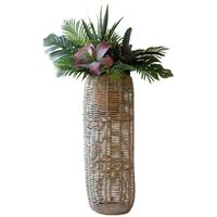 This Haitian-made woven seagrass barrel planter features internal metal ribs to hold a pot in place. 12” in diameter x 41” tall.