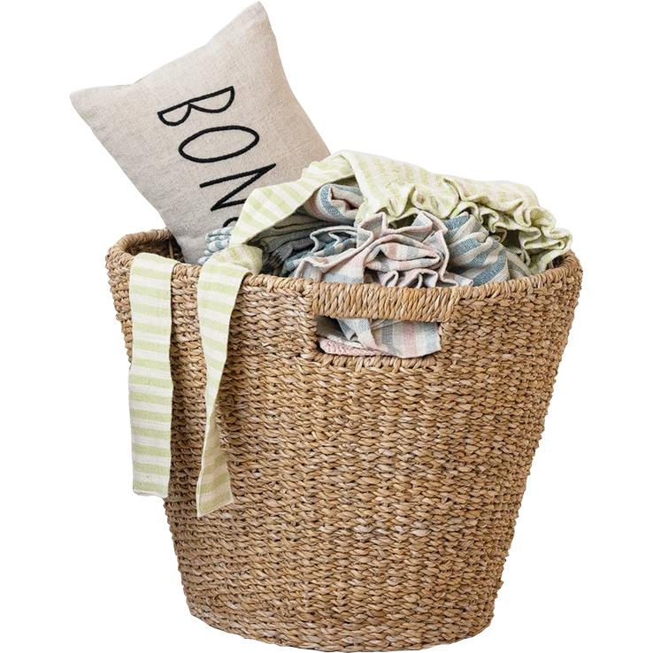 A great basket for holding this, that, and the other thing, this basket is hand-woven from natural seagrass and measures 18.25" in diameter and 15" high.