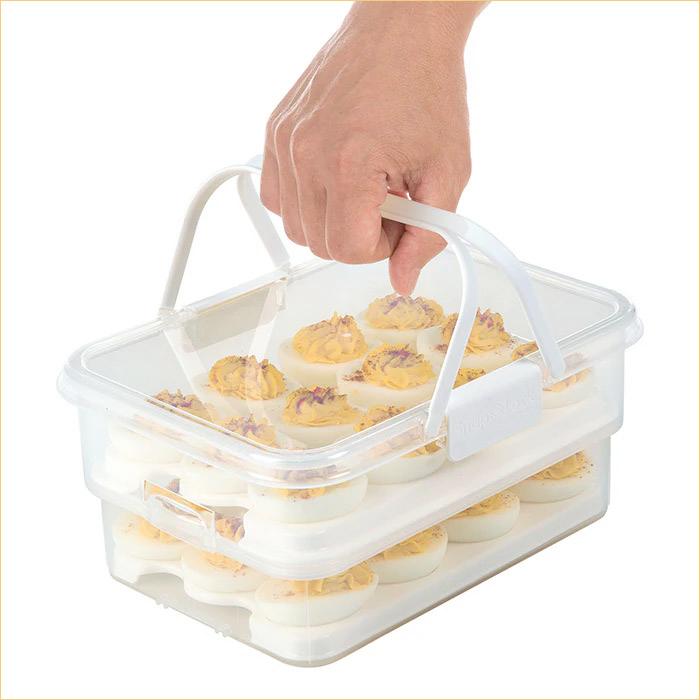 Everyone wants you to bring your deviled eggs to the party...but how? Here's the easy way to ensure that those little devils get there beautiful and intact. Designed specifically to transport deviled eggs, this compact carrier features a two-tier design with two removable fitted trays that each hold 12 eggs. The deviled eggs go in easy, are held secure, and because each tier has ample headroom, your piping and decoration stays perfect. Two basket-style handles keep the carrier level in hand and swing out of the way for easy access. The Snaplock hinged lid features a silicone seal to keep eggs fresh and the whole carrier measures just 10.25" x 7.75", collapsing to a mere 2.5" high for storage. It's all BPA free and dishwasher safe.