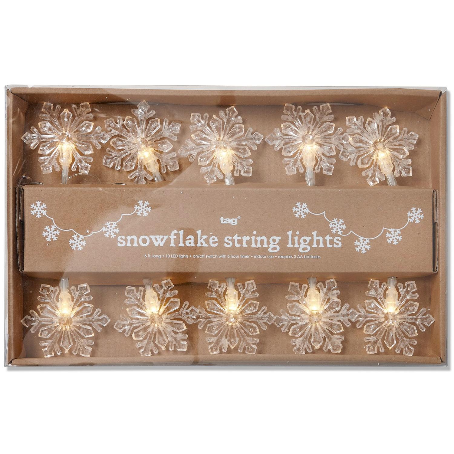 This 72" light garland features clear snowflakes that contain white LEDs, and a six-hour timer. Three AA batteries required (not included, indoor use only.