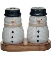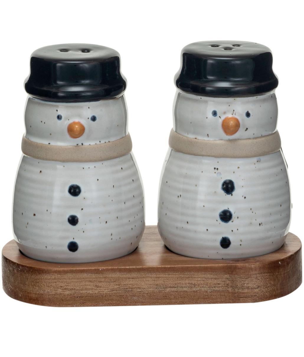 Made of rugged stoneware, these charming little snowman shakers sit on a solid-acacia tray. The shakers are approx. 3.25” tall.
