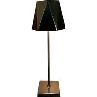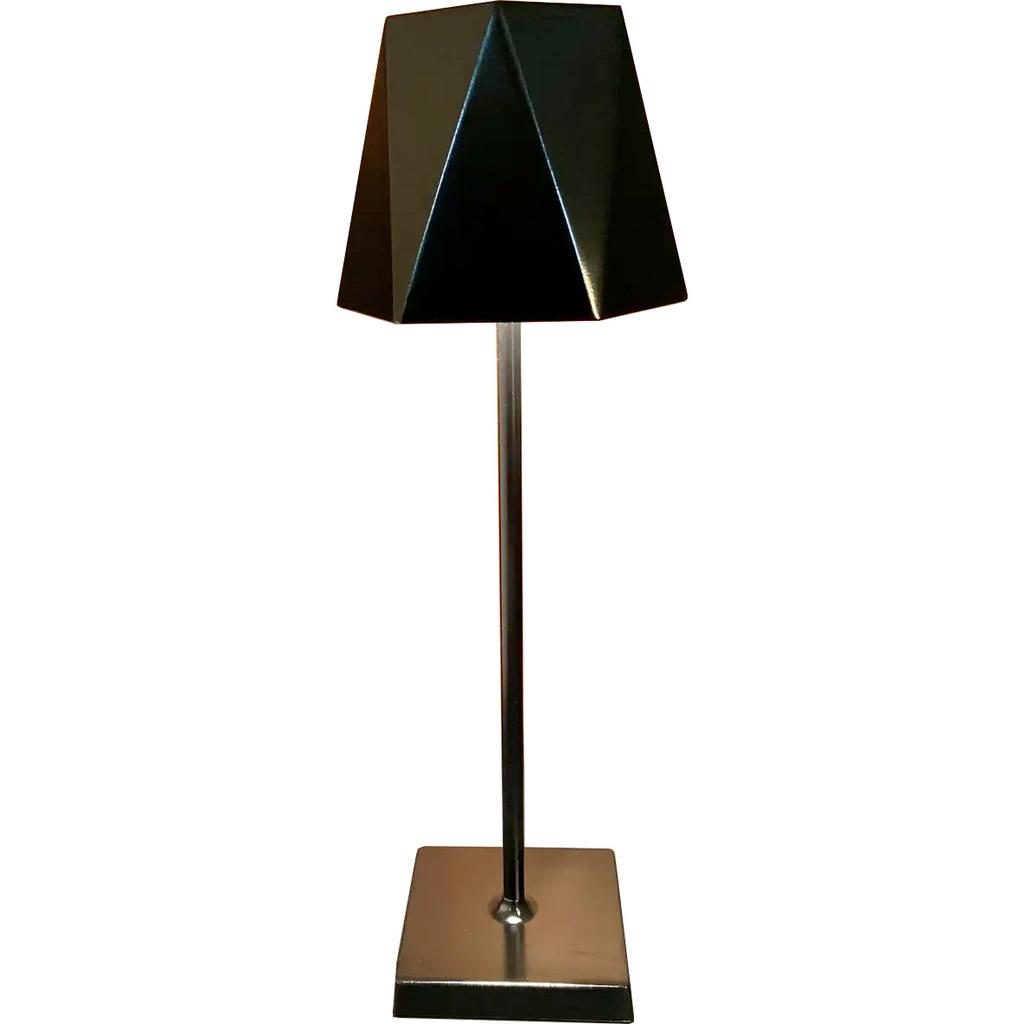 The cordless Soirée table lamp is a great way to add light to any space, indoors or out. It features a geometric metal shade and three levels of brightness via its rechargeable ion battery. Fully charged, it will provide up to 8 hours of illumination. Charging cord included, 14.75" tall, 5" diameter shade.