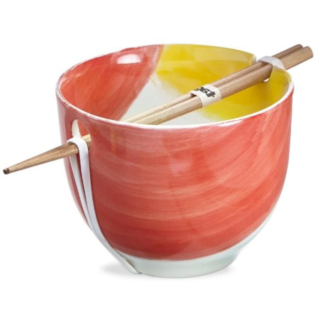 Made from durable stoneware this 16-oz. noodle bowl is complete with bamboo chopsticks. It measures 5” in diameter and 3.9” high. Dishwasher and microwave safe bowl, hand wash the chopsticks.