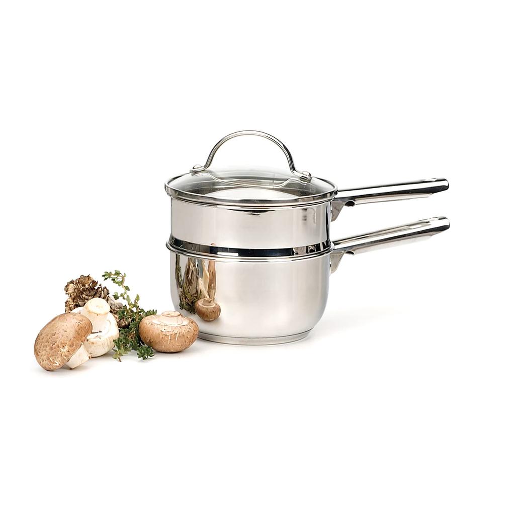 When you want to melt chocolate or make delicate sauces, you need a good double boiler like this. Its made of polished, 18/10 stainless steel with an aluminum-sandwich bottom on the lower pot, for rapid head conduction. The upper pot features a tempered-glass lid, essential for keeping an eye on delicate food. The handles are hollow and rounded to dissipate heat and maximize comfort.