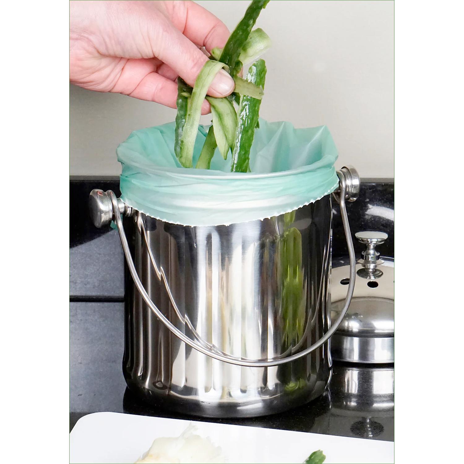 This compact compost pail is made of rugged stainless steel and features a set of two filters in the lid to capture odors and keep your kitchen smelling good. It measures 6” in diameter and 8.5” tall, with a capacity of a half-gallon. An extra set of filters is included and spare filter sets are available.