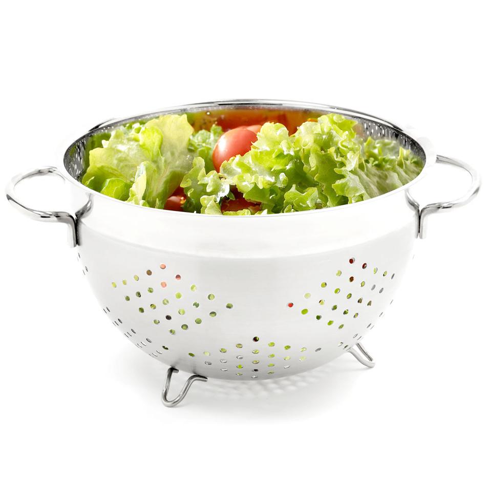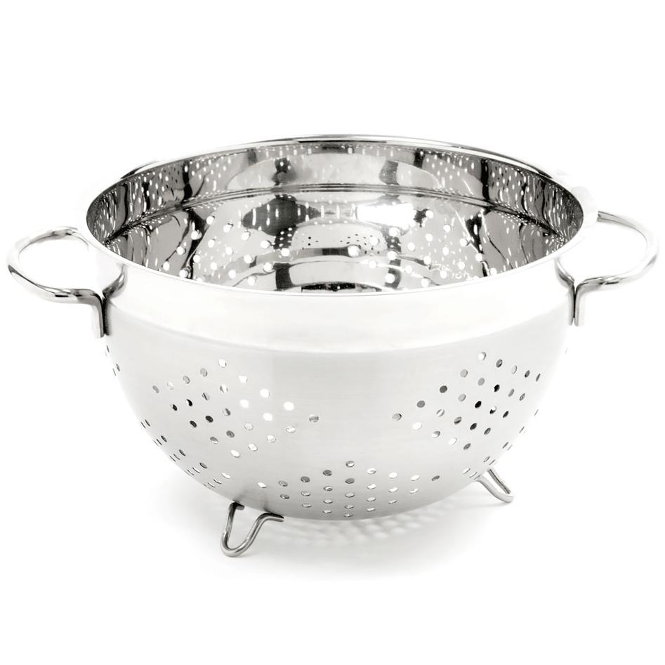 Brushed on the outside, polished on the inside, this all-stainless-steel colander measures 9.5" in diameter and 6.75" deep, giving you plenty of room for draining everything from vegetables to pasta. Sturdy, tripod feet keep it stable in the sink, and tubular handles make it easy to manuever. Dishwasher safe.