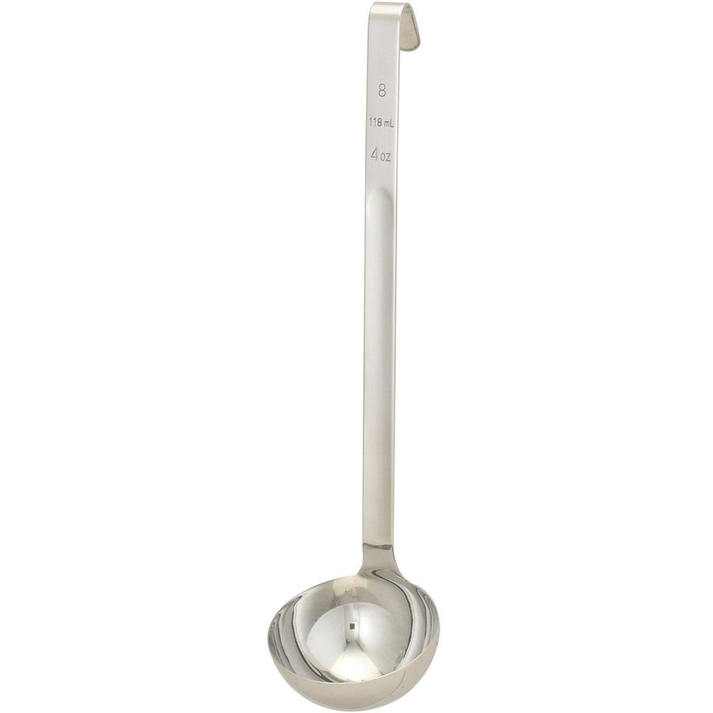 Made from a single sheet of 18/8 stainless steel with no welded joints or stress points, this stainless ladle is sturdy, durable, won't rust, and is dishwasher safe for easy cleanup. Its capacity is stamped right into the handle for easy serving and portion control without guesswork for both cooking and serving. The long handle easily reaches to the bottom of deeper pots and pans, while the hook at the end of the handle hangs on the side of deep pots to keep the ladle from falling in, and allows the ladle to store on a tool rack. 15" long, with a 3.25"-dia. bowl.